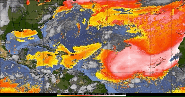 With dust present, convection is very limited across the entire ocean and that suppresses any low pressure from gaining momentum. In fact, it is even difficult for pop-up storms to develop when the SAL (Saharan Air Layer) is present.